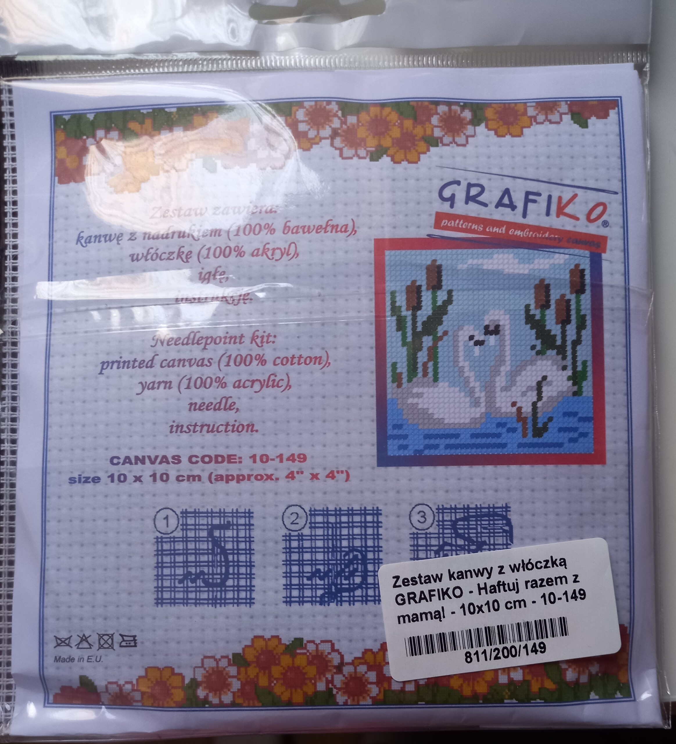 Zestaw zawiera: kanwę z nadrukiem ( 100% bawełna) o wymiarach 10 x 10 cm, włóczkę (100% akryl), igłę oraz instrukcję.